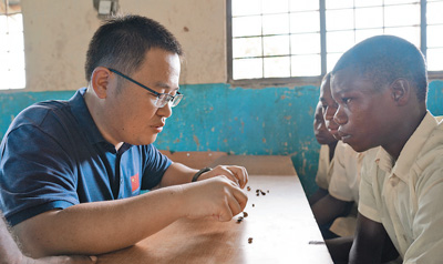 坦桑尼亚桑给巴尔,炎炎烈日下,中国土木工程集团有限公司(以下简称“中土集团”)承建的桑给巴尔100公里市政道路升级改造项目正在有序推进。“先填土,然后平整、铺砖。”工长许殿芝用斯瓦希里语和徒弟马布拉·阿卡巴·马甘加交流工作。