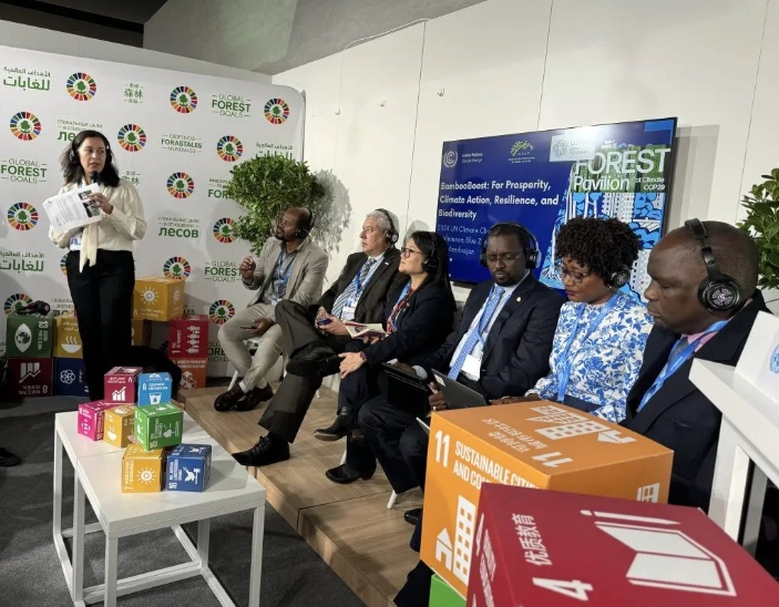 2024年11月19日,国际竹藤组织和《联合国气候变化框架公约》秘书处在《联合国气候变化框架公约》第二十九次缔约方大会(COP29)森林角共同主办“竹子助力促进繁荣、气候行动、恢复力和生物多样性”主题边会。来自六个竹子生产国的高级别政府代表参加边会,并就本国将竹子纳入国家自主贡献(NDCs)和国家适应计划(NAPs)的承诺发表简短声明。边会重点围绕竹子在一系列可持续发展目标行动中的作用展开。