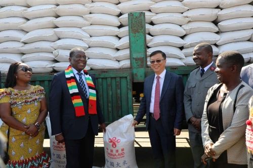 2024年8月22日,中国援津巴布韦紧急粮援项目举行交接仪式,津总统姆南加古瓦与中国驻津大使周鼎共同出席,津国防部长、外交部长、社会福利部长、地方政府部长等政府官员和民众代表近百人参加仪式