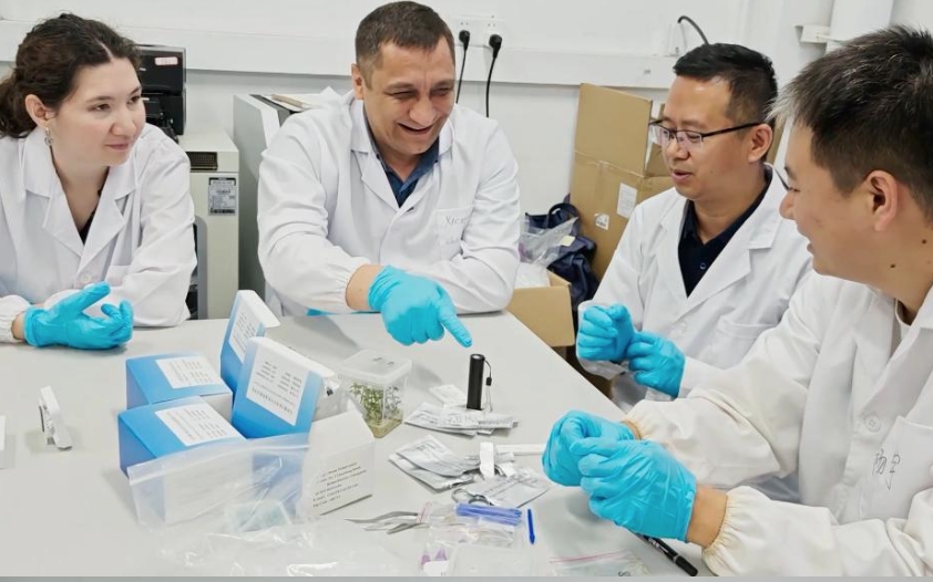 在西南大学科技大楼薯类生物学研究所的一间实验室内,来自哈萨克斯坦赛福林农业技术大学的两名师生,正和西南大学农学与生物科技学院院长吕典秋、薯类生物学研究所杨宇老师一起,使用马铃薯病毒快速检测试剂盒对马铃薯组培苗进行检测。