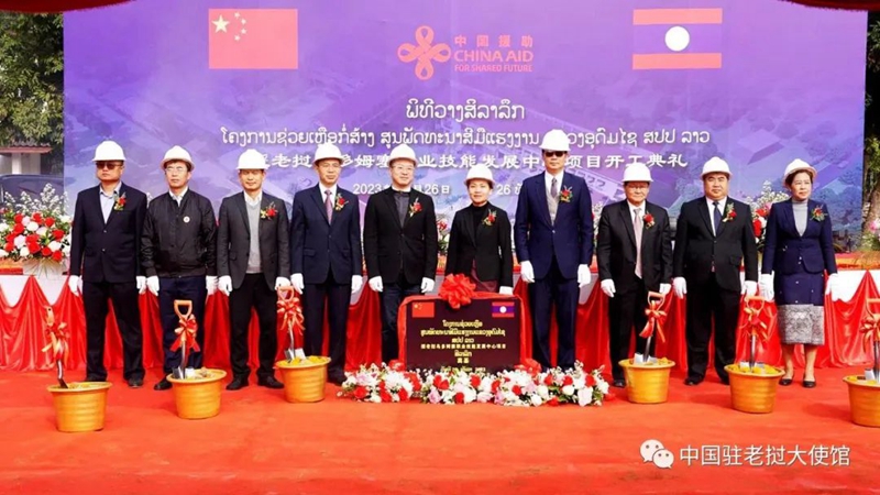 2023年12月26日,中国援老挝乌多姆赛职业技能发展中心项目开工仪式在乌多姆赛省勐赛县举行。中国驻老挝使馆临时代办王畅和老挝劳动与社会福利部长贝坎、乌多姆赛省委书记、省长本空等出席。驻老挝使馆经商处参赞赵文宇、驻琅勃拉邦总领馆及老中合作委员会、老挝内政部、乌多姆赛省中国商会、项目管理公司和建设公司等代表90多人参加。