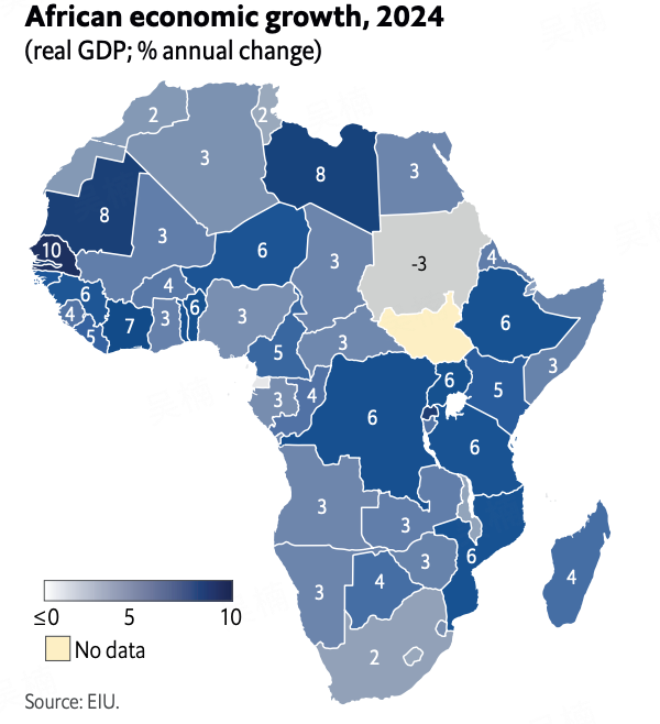 经济学人智库近日发布的报告预计,非洲经济增长将由2023年的2.6%升至2024年的3.2%,位居全球第二,仅次于亚洲。