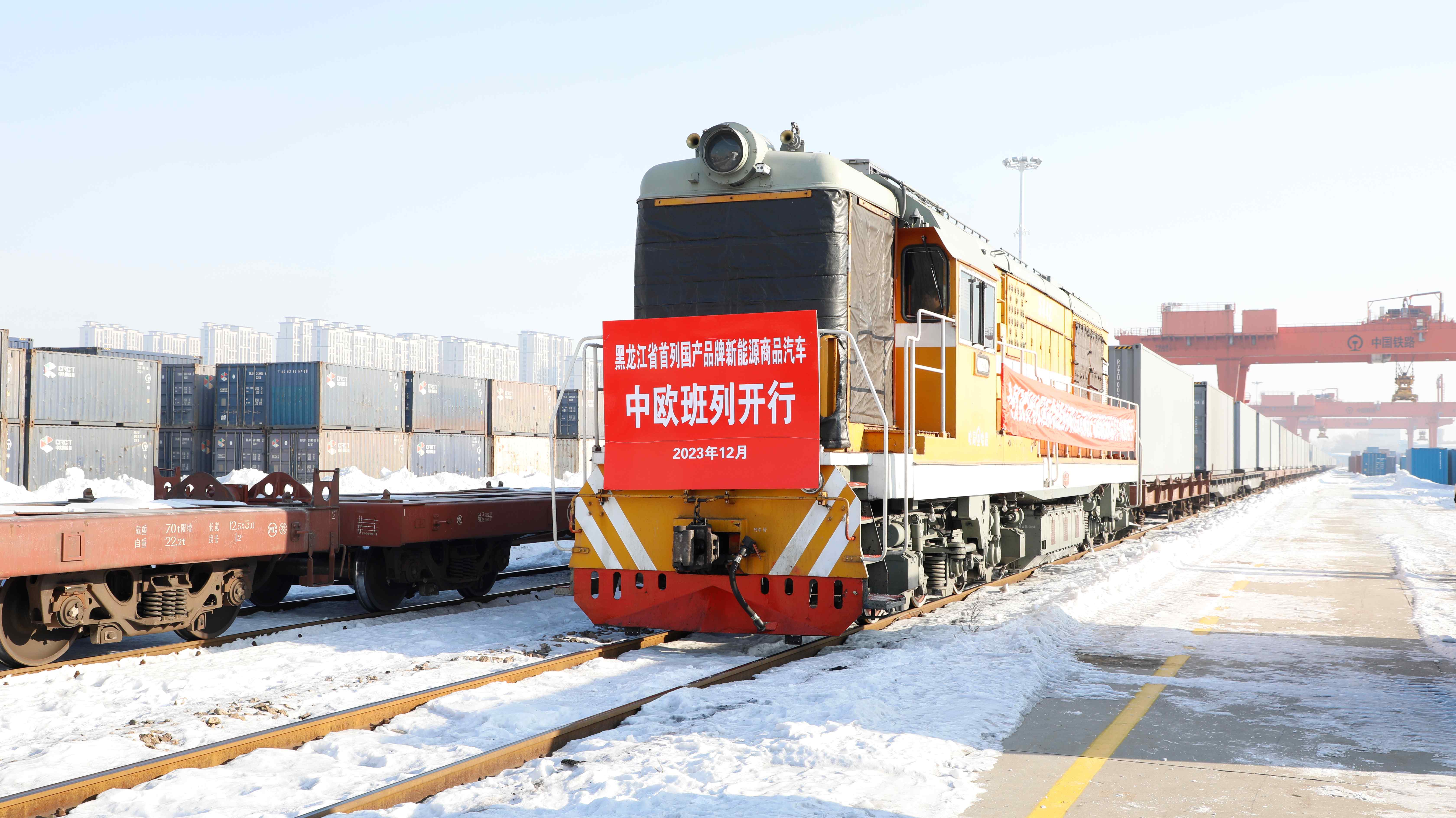 12月18日,一列满载55个集装箱110台新能源商品汽车的中欧班列,从哈尔滨国际集装箱中心站驶出,经同江铁路口岸驶向欧洲。这是今年黑龙江省继开通国产商品汽车、二手车中欧班列线路后,新开通的国产新能源商品汽车中欧班列线路。