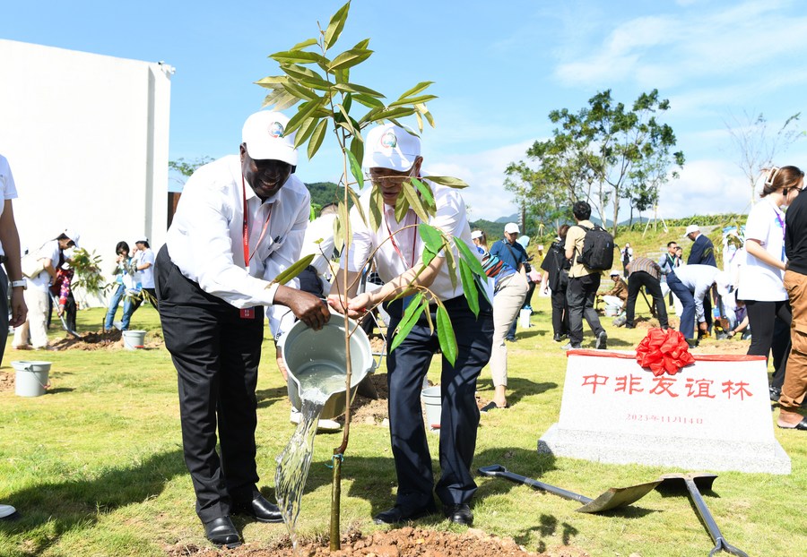11月14日上午,参加第二届中非农业合作论坛的非洲国家代表来到三亚水稻国家公园参观。在袁隆平铜像前,外宾们纷纷插下杂交水稻秧苗,缅怀这位“杂交水稻之父”。