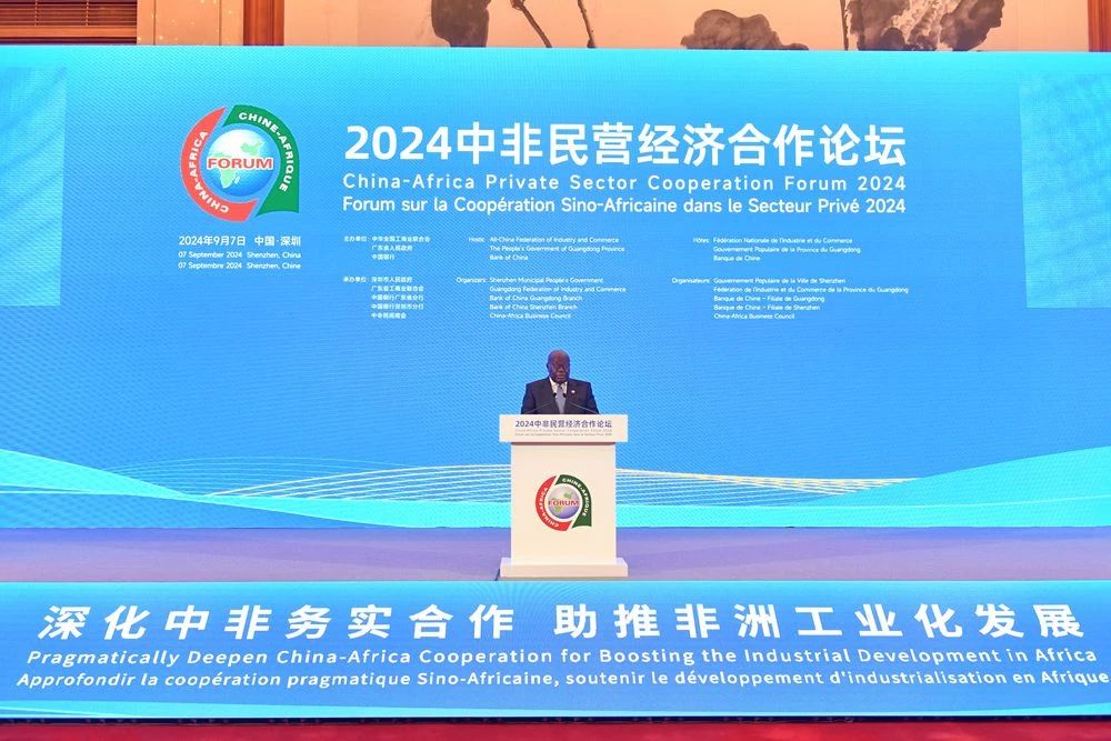 9月7日,由全国工商联、广东省人民政府、中国银行共同主办,深圳市人民政府、广东省工商联、中国银行广东省分行、中国银行深圳市分行、中非民间商会联合承办的2024中非民营经济合作论坛在深圳市召开,来自国内外的250余位嘉宾围绕“深化中非务实合作,助推非洲工业化发展”主题,共商合作,共话未来。加纳共和国总统阿库福-阿多,全国政协副主席、全国工商联主席高云龙,广东省政协主席林克庆,中国银行董事长葛海蛟出席论坛并致辞。论坛由广东省委常委、省政府副省长王曦主持。