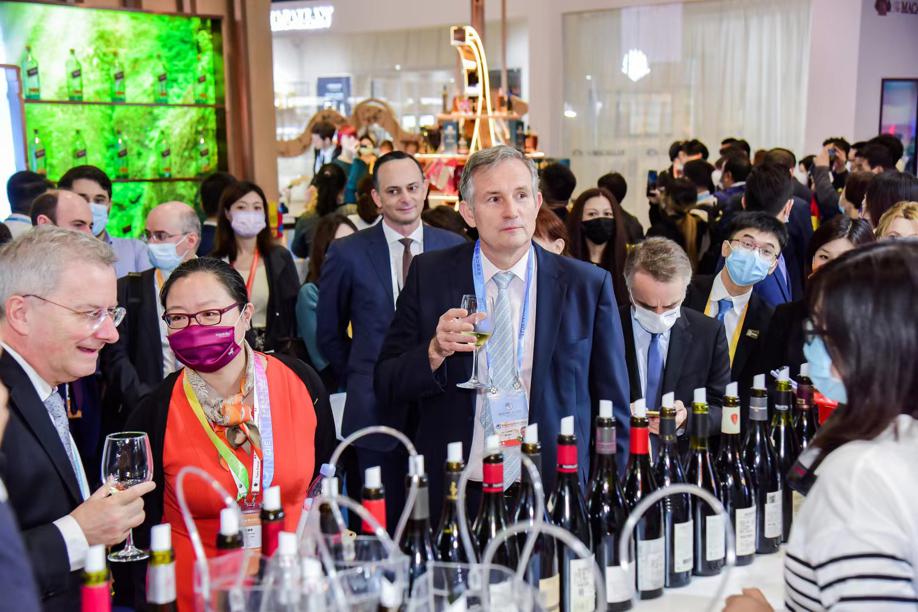 French ambassador Laurent Bili samples wine at French pavilioan at fourth China International Import Expo.