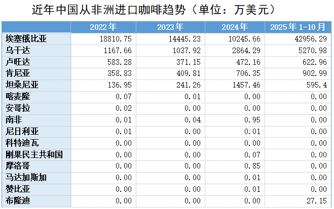 根据海关总署数据显示,2025年1-10月,中国从埃塞俄比亚、乌干达、卢旺达等非洲国家进口咖啡总额约 5.04亿美元,相较于前几年呈现显著增长。