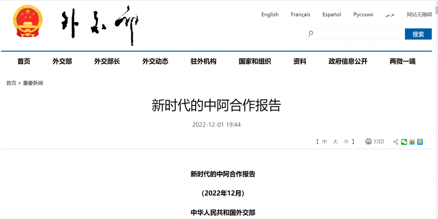 外交部12月1日发表《新时代的中阿合作报告》(以下简称《报告》),回顾中国同阿拉伯国家友好交往历史,梳理新中国成立后特别是新世纪新阶段中阿友好交往实践,展望构建中阿命运共同体的前景和方向。 《报告》约1.8万字,除前言、结束语外共包括四个部分,分别是传承千年的中阿友谊、新时代的中阿关系、变局交织中继续快速发展的中阿合作、构建中阿命运共同体。