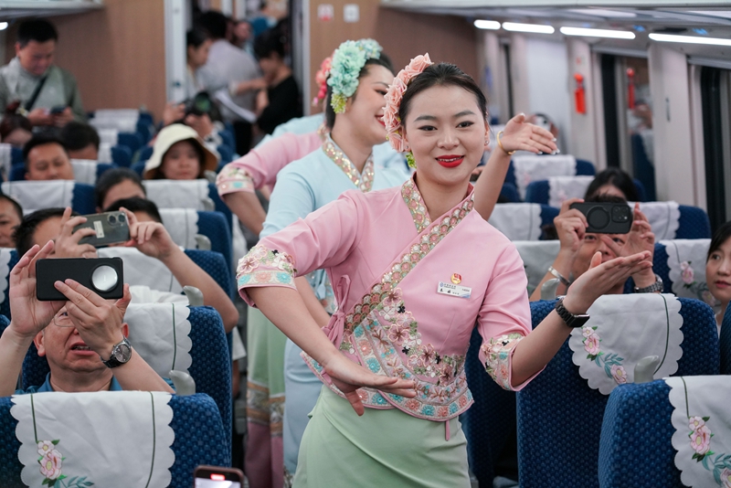 迎着朝阳,D87次列车从17站台缓缓驶出,向老挝万象加速奔驰而去。这一天,中老铁路迎来开通运营三周年。
