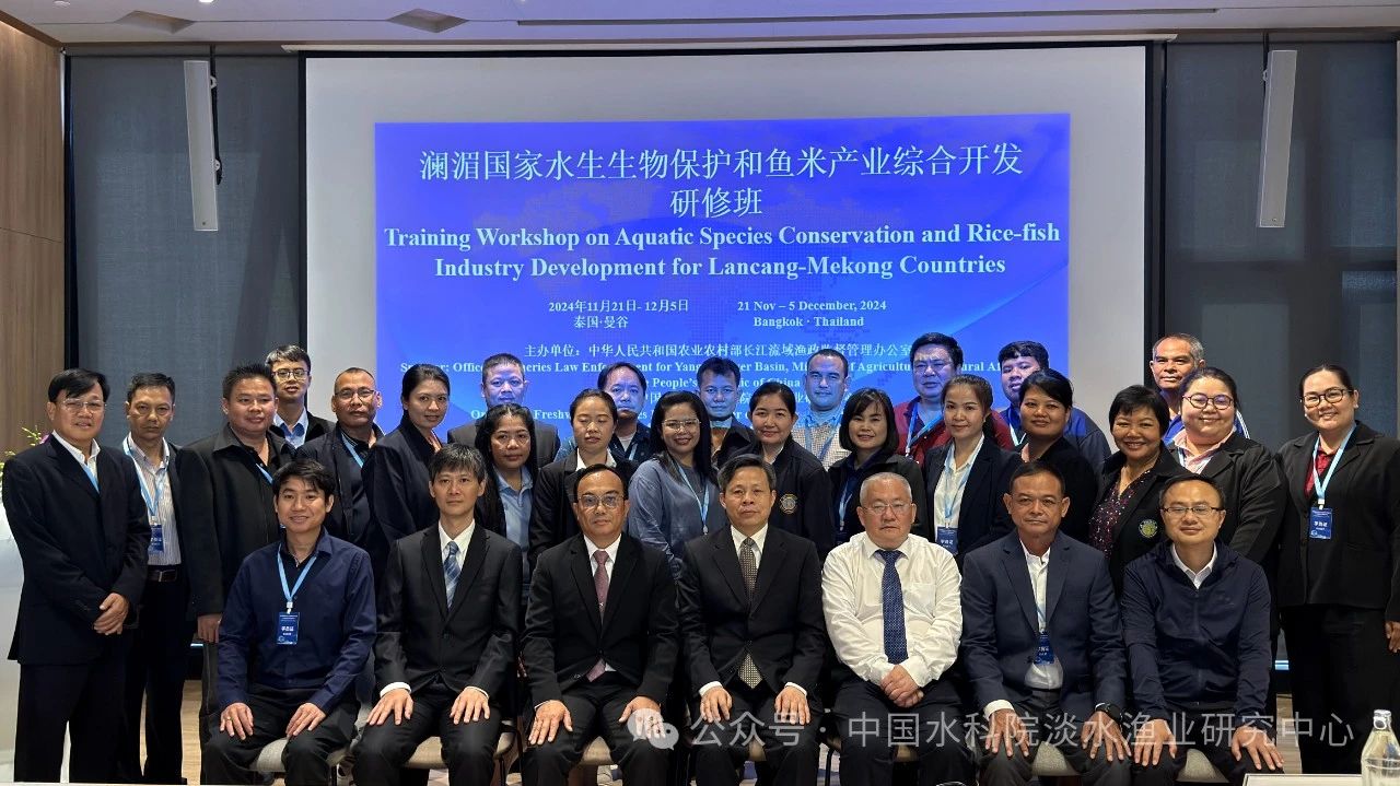 11月21日,由农业农村部长江流域渔政监督管理办公室主办,中国水产科学研究院淡水渔业研究中心、泰国渔业局共同承办的“澜湄国家水生生物保护和鱼米产业综合开发研修班”在泰国曼谷开班。长江办副主任黄晓发、淡水中心副主任邴旭文,泰国内陆渔业研究与发展中心主任Wisanuporn Ratanatrivong、渔业局国合处处长Choltisak Chawpaknum出席开班仪式及相关活动。